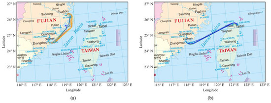 The modified clustering results of ship trajectories in Figure 20 based on the enhanced BIRCH algorithm. (a) shows the clustering results of ship trajectories from Fuzhou Port to Xiamen Port, where the ship trajectories are clustered into four groups. (b) shows the clustering results of ship trajectories from Xiamen Port to Keelung Port, where the ship trajectories are clustered into two groups.