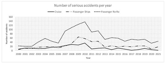 Number of serious accidents per year for passenger ships, period 2000–2021.