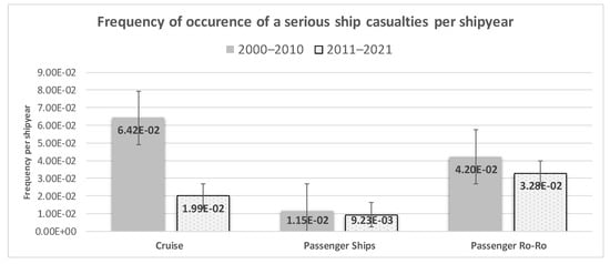 Figure 6 presents the overall frequency of occurrence of serious accidents for the decade 2000–2010 and for the decade 2011–2021. Focusing on the last decade, 2011–2021, there is a remarkable reduction in the overall frequency of occurrence, especially for Cruise ships, whereas Passenger Ro-Ro ships appear to have the highest frequency (3.28 × 10−2) among the studied passenger ship subtypes in the last decade. The estimated uncertainty ranges of shown frequency data, which were obtained after a standard data series error analysis, are significant, especially for the lower values of shown frequencies observed for pure passenger ships, and this is due to the scarcity of available data, what is inherent to the statistics of data of passenger ship accidents, that are comparably low in terms of absolute numbers.