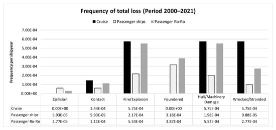 The analysis of ship total losses can provide some insight into how often, and disastrous a catastrophic event happens. Within the studied period and accounting for all studied accident categories, the frequencies of ship total losses by ship subtype are given in Figure 7. It is observed that although the frequency of accident occurrence has a declining trend in the last decade, 2011–2021 (Figure 6), the frequency of ship’s total losses has increased for all passenger ship subtypes in the same period, Table 4.