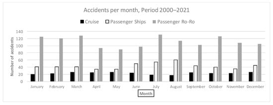 Figure 9 presents the seasonal pattern according to serious ship casualties per month in the period 2000–2021. In general, there is a smooth, quite balanced distribution of ship casualties over the months. Cruise ships exhibit quite similar percentages per month without significant variations throughout the whole year. Focusing on (Pure) Passenger ships, an increased number of incidents seems to take place during the summer period, namely June to August (32% of accidents), in view of increased seasonal activity in summer. Passenger Ro-Ro ships tend to get involved in a relatively higher number of accidents also during winter time (January to March) and summer season.