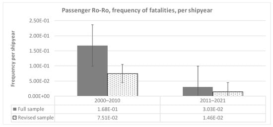 When excluding the above two accidents from the statistics, the overall frequency of accident occurrence per decade remains almost the same, as already presented in Figure 6. The frequency of Passenger Ro-Ro ship’s total losses was also slightly reduced to 1.01 × 10−3 for the period 2000–2010 and to 2.58 × 10−3 for the period 2011–2021 in comparison with Table 4. However, fatality rates significantly reduced by around 50% for both decades, Figure 10. This result demonstrates the volatility of observed statistical values that should always be used with care and full consideration of the ensuing uncertainties.