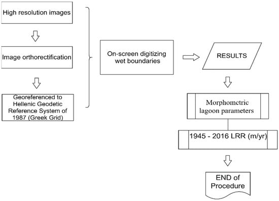 In the present study, different high-resolution datasets, such as high-resolution Greek official orthomosaics, aerial photos, satellite, and CORONA declassified images, with spatial resolutions ranging from 0.25 to 5 m, were combined and processed. All of the images showed 0% cloud cover over the study area and were used to digitize the polygons of the lagoon’s water surface. Official orthomosaic datasets from 1945, 2008, and 2016 with spatial resolutions of 1.0, 0.5, and 0.25 m, respectively, were the most accurate datasets for the Greek territory and were acquired through the National Greek Cadastre and Mapping Agency. We did not process these datasets any further. For the years 1960 and 1987, analogue aerial photographs at 1:30,000 scale with 60% along track overlap were accessed through the Hellenic Military Geographical Service (HMGS). For the year 2000, a panchromatic scene of the Indian Remote Sensing satellite (IRS) with a spatial resolution of 5 m was used. Finally, CORONA declassified images from 1965, 1968, and 1975 were freely downloaded from the United States Geological Survey (USGS) through the Global Visualization Viewer (GLOVIS) site (http://earthexplorer.usgs.gov/, accessed on 13 January 2023). ERDAS IMAGINE Leica Photogrammetry Suite (LPS) software was used to process the images, ArcGIS 10.8 software was used for vector generation, editing, and map composition, and DSAS v5.0 software was used for statistical analysis [31]. The DSAS functionalities were described in detail in a previous study [32]. All datasets used in the current study are presented in Table 1.