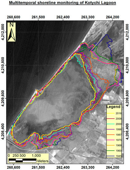 The second model concerned the estimation of the lagoon’s shoreline change during the same period (1945–2016) using the LRR statistical rates provided by the DSAS plug-in. The LRR was calculated including all the available datasets and determined by fitting a least square regression line from all shoreline positions along each transect. The inclination of the line was the linear regression rate [31]. The method had the potential to use more than two shorelines and thus overlap the disadvantages of the end point rates (EPR) [33].