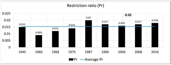 In Figure 4, the calculated restriction ratio (Pr) values are presented. The Pr indicates if the lagoon is isolated or communicates with the sea. The Pr values ranged from 0 to 1. Values close to 0 correspond to a lagoon isolated from the open sea, while values close to 1 correspond to a lagoon that communicates with the sea [19]. For the Kotychi Lagoon, the Pr values fluctuated between 0.01 and 0.02, while the average value was 0.02, corresponding to a lagoon isolated from the sea.