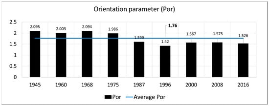Kotychi Lagoon orientation parameter (Por) index fluctuations during the study period. The blue line represents the average Por value.