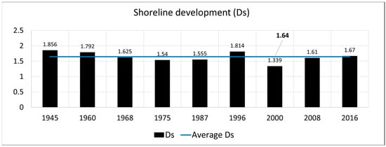 In addition, the shore development parameter (Ds), which indicates the shape of the lagoon’s shoreline in comparison to the circumference of a circle with an area equivalent to that of the lagoon, had values ranging from 1.339 (min) to 1.856 (max). Ds values equal or close to 1 mean that the lagoon’s shape is closer to a circle. The mean Ds value was 1.64, corresponding to a flattened lagoon (Figure 6).