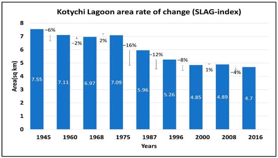 Moreover, regarding the lagoon’s water surface area fluctuations (SLAG-index), the maximum rate was 7.55 km2 in 1945, while the minimum rate was 4.7 km2 in 2016, and the mean rate was 5.19 km2, showing that significant shrinkage had occurred during the 1945–2016 period (Figure 8). In addition, although the water surface fluctuations were close to 7.0 km2 for the 1945–1975 period, a severe redaction of the water surface had occurred since 1975, which continued until 2000. The total reduction for this period was 36%, while it seemed that the water surface area stabilized in the period 2000–2016 to a value of approximately 4.8 km2.