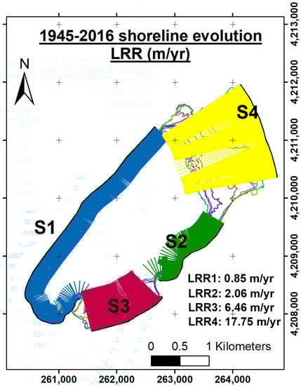 The shoreline change rates based on LRR, such as maximum (max) and average values, were computed for each shoreline segment and expressed for the period of 1945–2016, as shown in Table 4.