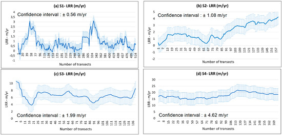 LRR values in each section in conjunction with the confidence band (LCI90%). (a) S1 section with LCI90% of ±0.56 m/year, (b) S2 section with LCI90% of ±1.08 m/year, (c) S3 section with LCI90% of ±1.99 m/year, and (d) S4 section with LCI90% of ±4.62 m/year.