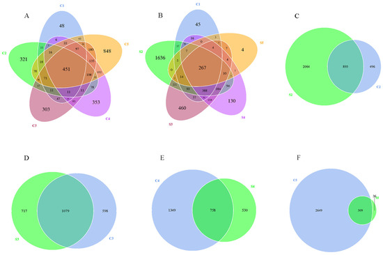 Venn diagram representing shared operational taxonomic units (OTUs) between samples from the control group and the treatment group of silver pomfret taken at different times. (A) control group, from C1 to C5; (B) treatment group, from S1 to S5; (C) C2 vs. S2; (D) C3 vs. S3; (E) C4 vs. S4; (F) C5 vs. S5.