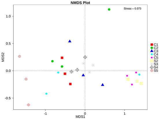 Nonmetric Multidimensional Scaling (NMDS) plot of the control and treatment groups. Patterns of different shapes and colors represent different samples, each point in the diagram represents one sample, and samples from the same group are represented by the same patterns.