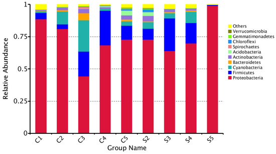 From treatment S1 to S5, the relative abundance of Proteobacteria decreased first (S1–S3) and then increased (S3–S5), peaking at 99.10%. The control samples (C1–C5) showed the same trend. The relative abundance of Firmicutes in the treatment group samples (S1–S5) increased, with a maximum value in S3 (25.30%), and then decreased to 0.66% at S5. The tendency of control groups was similar to the treatment groups; however, the relative abundance of Firmicutes was highest in sample C4. Comparing the experimental group with the control group at the same period, we found that the relative abundances of Firmicutes, Actinobacteria and Acidobacteria of S2 were higher than those of C2, whereas the relative abundances of Proteobacteria, Cyanobacteria and Bacteroidetes were less than those in C2. The relative abundances of Proteobacteria and Firmicutes in S3 were higher than those in C3; however, the relative abundances of Cyanobacteria and Bacteroidetes in S3 were much lower than those in C3. The top three dominant microorganisms in terms of relative abundance in C4 and S4 accounted for the vast majority, except that the abundances of Firmicutes, Proteobacteria and Cyanobacteria in S4 were higher than those in C4. In S5, in addition to the Proteobacteria, the relative abundance of other microorganisms was much lower than in the C5 sample.
