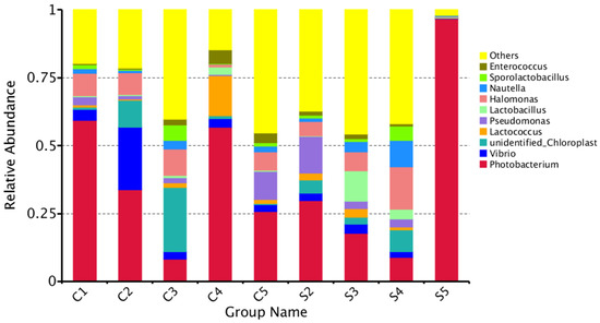 The microbial composition and relative abundance of the top 10 genera are shown in Figure 5, including Photobacterium, Vibrio, unidentified_Chloroplast, Lactococcus, Pseudomonas, Lactobacillus, Halomonas, Nautella, Sporolactobacillus and Enterococcus. The dominant microorganisms at the genus level were almost all different in each group. The relative abundance of Photobacterium, as the main dominant bacteria, varied greatly in each group (p < 0.01), ranging from 8.14% (minimum value in C3) to 96.80% (maximum value in S5). The relative abundance of Vibrio was 22.98% in C2 and was significantly higher than that in the other groups (p < 0.01). Interestingly, the relative abundances of Lactococcus in the C4 group, Lactobacillus in the S3 group and Halomonas in the S4 group were much higher than those in the other groups (p < 0.01).