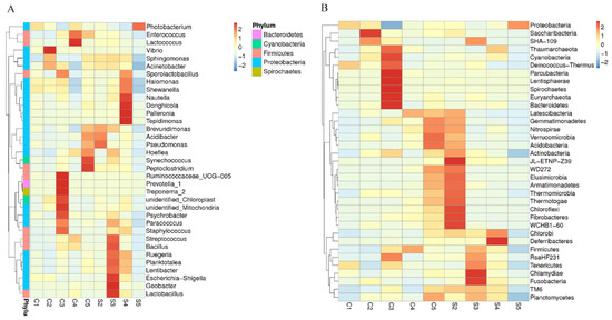 Heatmap at the genus (A) and phylum (B) level of the of control and treatment groups. The horizontal axis shows the sample information, and the vertical axis shows the species annotation information. The species clustering tree is on the left.