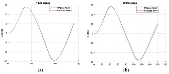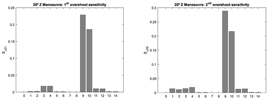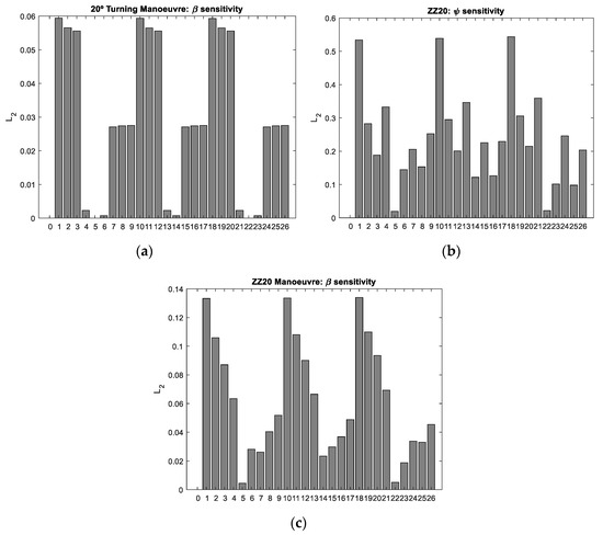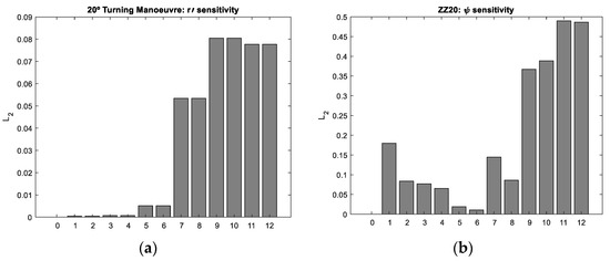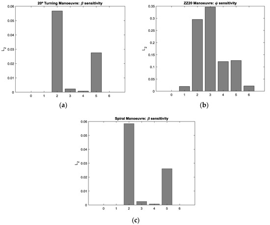 The sensitivity results of the zigzag manoeuvre showed that the output parameters and had the highest sensitivity to perturbation in , closely followed by . The highest sensitivities were those of the output parameters and . The drift angle was the least sensitive output parameter, with about 23% of the sensitivity of .