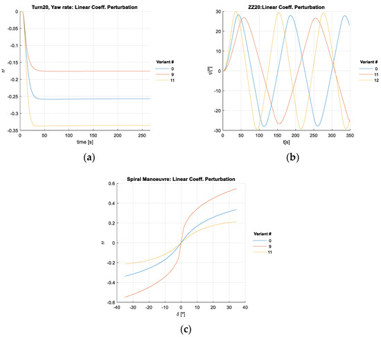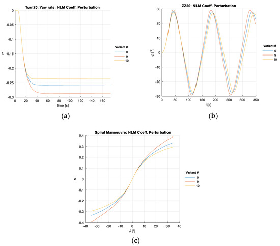 Figure 8 presents the reference run (variant #0) and the variants causing the maximum output parameter variation in some of the simulated manoeuvres when a partial perturbation of the nonlinear single variable coefficients was performed.
