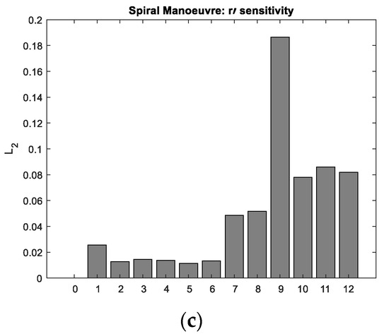 The output parameter most sensitive to the spiral manoeuvre was the yaw rate, . This variable was most sensitive to , but also exerted a significant degree of influence. was sensitive to the same coefficients as but had much less sensitivity (about 34% of the sensitivity of ). was the least sensitive output variable (about 17% of the sensitivity of ).
