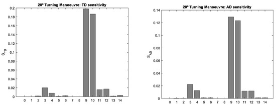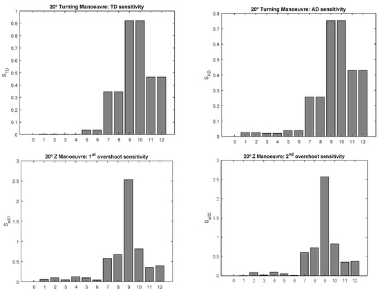 In the zigzag manoeuvre, the sensitivity of all output parameters was the highest for and . For Z10, the sensitivity was highest for and for Z20, the sensitivity was highest for . The output parameters also showed non-negligible sensitivity to , although the relative influence diminished as the rudder angle increased. Comparing these levels of sensitivity to those relative to linear coefficients, they were on average about 11% of the latter. Above this level of sensitivity were the coefficients and . Comparing the levels of sensitivity of these coefficients to those of NLS coefficients, they were on average about 200% of the latter.