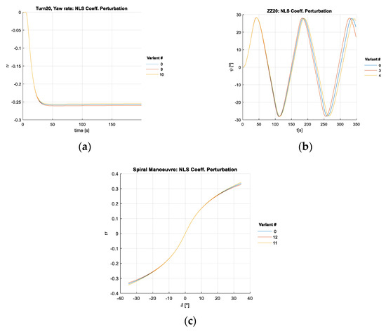 The most sensitive output parameter observed for the perturbation of the nonlinear single-variable coefficients (NLSs) was in spiral and turning manoeuvres and and in Z manoeuvres. The most relevant NLS coefficient, , was the rudder nonlinear drag for all manoeuvres.