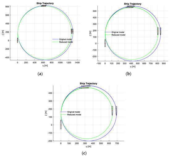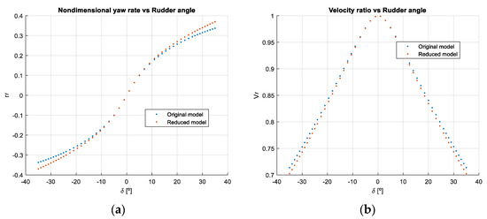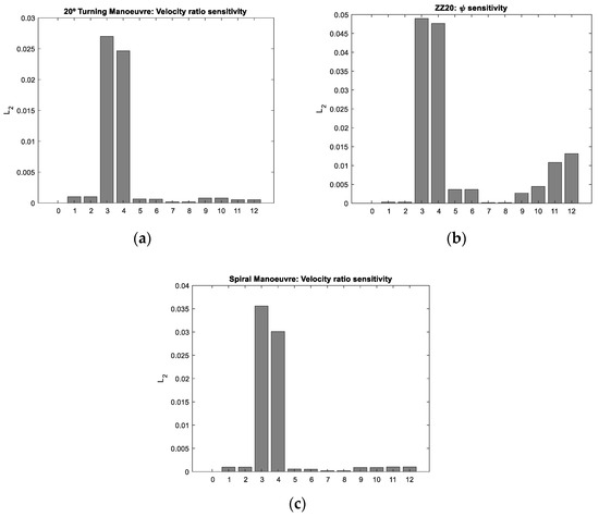 Depending on the manoeuvre, the output parameters most sensitive to NLS perturbation were: the velocity ratio, (turning and spiral), and (zigzag), which were essentially sensitive to . Comparing the levels of sensitivity of nonlinear single-variable coefficients with those of linear coefficients, the first was on average about 2% of the latter. Therefore, the mathematical model was less sensitive to the nonlinear single-variable parameters, which in this model were of the second and third order, the latter with a diffuse physical meaning, while the former was the hull and rudder nonlinear drag: respectively.