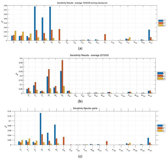 18] present a sensitivity analysis using the indirect method, both using the same 4DOF mathematical model of a container ship, with 18 hydrodynamic coefficients in the surge equation and 28 in each of the sway equation and yaw equation. Bearing in mind the different hull types in this study and those referenced, and also the different metrics, it is interesting to note that the results obtained by Wang et al. [