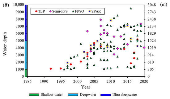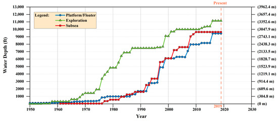 In the last thirty years, the offshore petroleum industry has accelerated its capabilities of offshore petroleum production activities operating at depth, rising from approximately 500 m to 3000 m, as depicted in Figure 1. Deepwater production contributed more than 10 million Barrels of Oil Equivalent (BOE) per day in 2019 and is expected to reach 14.5 million by 2025 [1].