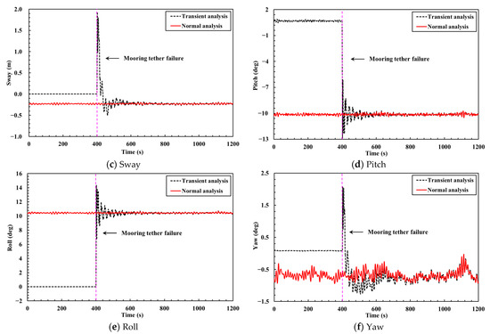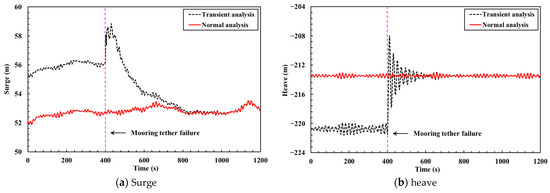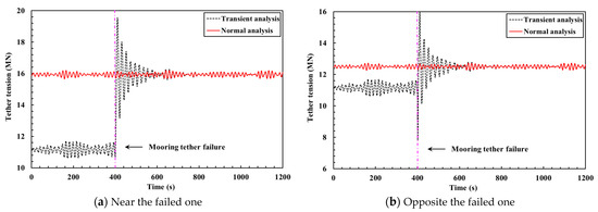 Figure 14 and Figure 15 present the motion responses of the MCP and the top tension of the remaining tethers obtained by different methods in Case 1. From the figures, an obvious mutation can be observed during the simulation when the transient analysis method is applied. For instance, compared with those provided by the normal analysis method, the maximums of the results increase sharply by 9.87% in surge and 21.63% in the top tension of the tether near the failed tether, respectively. The results show that the transient analysis method tends to provide more safety than the normal analysis method does. In addition, the top tension on the remaining tether near the fractured tether increases more significantly in comparison with that on the tether opposite the failure position, which is considered the critical tether under damage conditions and has the potential to fail sequentially.