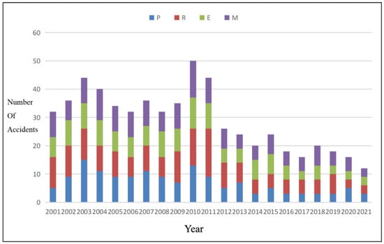 First, accidents caused by Ship (P)–Man (remote control factors, R)–Environment (E)–Management (M) from 2001 to 2021 were collected as the initial data of traditional ship navigation accidents, as shown in Table 1 and Figure 2. Secondly, by consulting experts, we confirmed the specific risk factors from four main factors: ship factors (P), shore-based remote control factors (R), environment factors (E) and emergency management factors (M). Then, 609 traditional ship accident data were transformed into 262 accident data that match autonomous ships, as shown in Table 2 and Figure 3. Before 2010, ships still lacked autonomous auxiliary equipment. With the development of science and technology, more autonomous auxiliary equipment was used on traditional ships. We also know that, when these intelligent devices were first put into use, both the proficiency of the operators and the defects of the equipment itself were not mature, so the maritime traffic accidents caused by them also increased. With the continuous proficiency in operation and the improvement of some equipment defects in the process of use, the resulting maritime traffic accidents also decreased. That is to say, in the statistical data, there was a peak around 2010. By analogy, it can be predicted that the number of accidents that may occur in the initial stage of the development of smart ships will increase in the future and will peak at a certain time. With the continuous improvement and maturity of relevant technologies, the number of accidents will decline.