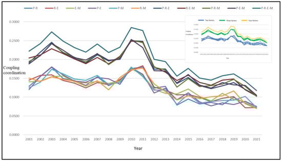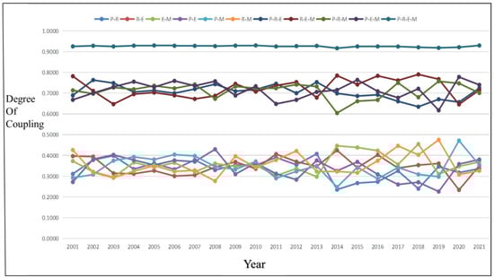 The coupling coordination degree is mainly used for the horizontal evaluation of navigation risks. According to the Equations (10)–(12), the results are shown in Table 4, Table 5, Table 6, Table 7 and Table 8, and the visualization results are shown in Figure 5, Figure 6 and Figure 7. The results show the following: (1) The coupling of two factors presents a weak coupling degree, while the coupling of three and four factors is generally in a strong coupling degree. In two-factor coupling, the coupling degree of E-M is the largest. Moreover, in three-factor coupling, the coupling degree of R-E-M is the largest. These two conditions are the most likely to cause navigation accidents. (2) Referring to the coupling coordination index between risks before 2010, it presents a large value, which represents a high degree of consistency between these risks in the development process and will increase the probability of accidents. After 2010, the degree of consistency between risks gradually decreased, while the risks gradually changed from orderly development to disorderly development, and the navigation became safer. (3) The coupling coordination degree of two factors is smaller than that of three factors. Moreover, the coupling coordination degree of three factors is smaller than that of four factors. (4) The coupling coordination degree related to ship factors is generally small, which indicates that, with the development of science and technology, the impact of scientific and technological risks will be much smaller. (5) Environment factors are important to increase the coupling coordination degree, which indicates that environment factors are still the weak link of autonomous ships’navigation safety in the future. Moreover, it is followed by emergency management factors, shore-based remote control factors and ship factors.