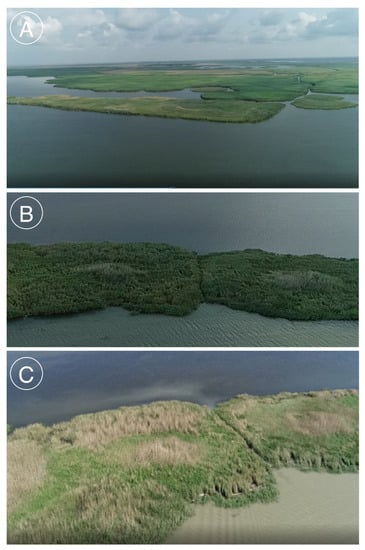 River mouth areas are also subject to seasonal and interannual fluctuations, where it is difficult to determine the “true” water areas. In [], the authors calculate the area of Kulikovsky Bay using NDVI as the sum of the open water surface and the “islands” of vegetation (reed and cattail), but they do not take into account the thickets of macrophytes that grow along the coastline of the estuaries. In modern conditions, the coastal part of almost all estuaries is overgrown mainly with Phragmites australis, occasionally with Typha angustifolia L. and Schoenoplectus litoralis. Helophytes of Chumyaniy firth were represented by only one species, Phragmites litoralis, hydrophytes, Stuckenia pectinata L., Ceratophyllum demersum L., Charophyceae, and Ulothrix zonata (Web. et Mohr.) Kütz.