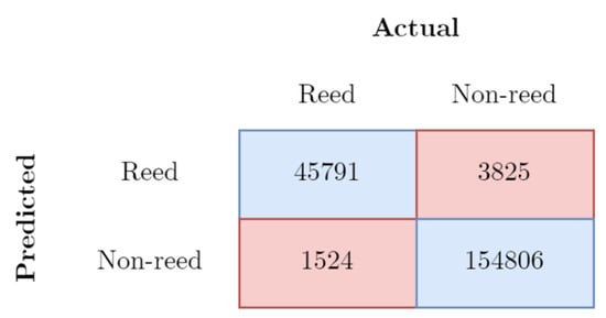 The collected dataset was split into train and test datasets with a proportion of 75% to 25%. The accuracy of the results was estimated using overlapping predicted reed locations with test data. As a result, the calculated accuracy reached 92%. The final resolution of the classified images was 10 m.