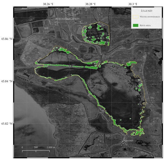 One of the important conditions for efficient fish breeding is a water body state, which is related to the quality and quantity of the macrophytes there. For example, for Stizostedion lucioperca (Linnaeus, 1758), the total productivity of the phytomass should not be higher than 10–15 t/ha, while for Rutilus heckeli (Nordmann, 1840), it is 30 t/ha. Overgrowing with aquatic vegetation reduces the productivity and stability of the spawning water bodies and leads to a decrease in accessible breeding areas for commercial fishes []. Present conditions of overgrowth with aquatic vegetation in the Azov Sea estuaries are characterized by an open field, mainly due to hard accessibility, low water levels, siltation, etc. Thus, one of the solutions can become the usage of remote sensing data [].