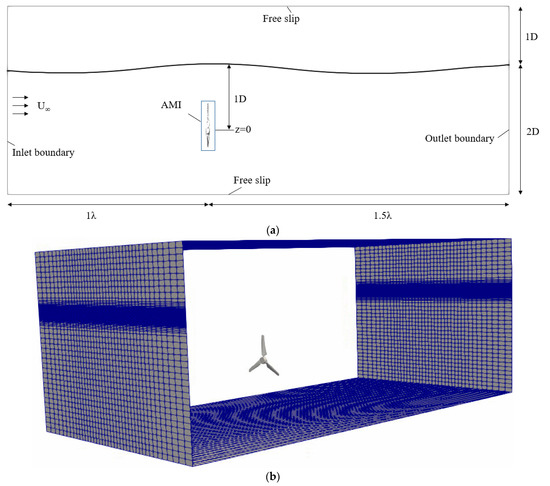 An arbitrary mesh interface (AMI) method was selected for the turbine blade rotation, where the sliding interfaces between the turbine inner and outer mesh blocks were employed. The diameter of the AMI region was 1.2D, where D represents the turbine’s diameter. The inlet boundary was set to the waveVelocity entry, which generated the waves by reading constant/waveProperties files [16]. The outlet boundary used the waveAbsorption2DVelocity outlet, which absorbed waves at the boundaries. The bottom, side, and top boundaries were set as the free slip condition. For the turbine blades, the rotating wall velocity was applied. The volume fractions of the air and water phases were set to 0 and 1, respectively. The hydrostatic pressure was defined in the domain. The computational domain had a length of 2.5λ (=9D), a width of 2D and a height of 3D, where λ represents the wavelength. Figure 1 shows the boundary conditions and the computational domain extent.