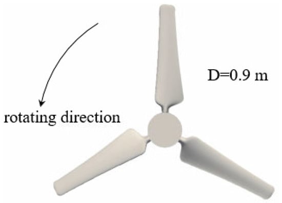 The baseline model of HATST [23] is as shown in Figure 2 and has a three-bladed HATST of a selected diameter of 0.9 m. The blades rotated counterclockwise. The NACA 63–418 hydrofoil section was used for the turbine blade. To maintain a uniform lift force generation in the spanwise direction, various twist angles of the hydrofoil section were applied in various spanwise positions [24].