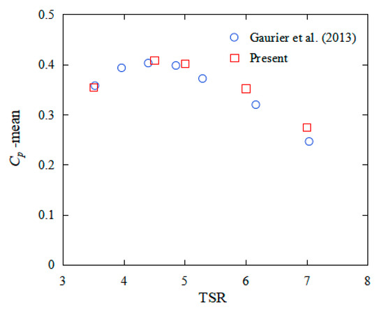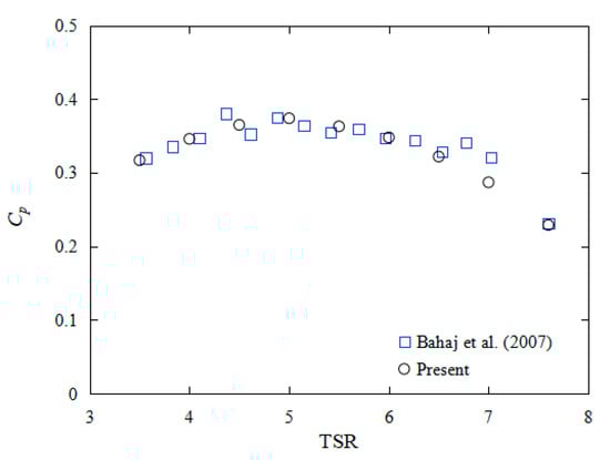 To verify the numerical methods, the test condition for the HATST with the current only was selected [6]. The free surface was not considered. A three-bladed turbine with a 0.8 m diameter was used in the experiment. The blade shape was designed with 17 hydrofoil sections in the spanwise direction. The experiments were carried out in a 2.4 m × 1.2 m cavitation tunnel. The dimensions of the turbine and incoming velocity of 1.54 m/s were similar for both the experiments [6] and the present simulations. The power coefficients were obtained by changing the inflow velocities. The comparison of the present and experimental results for various TSRs is shown in Figure 4. The power coefficient for various TSRs of the present CFD results showed a similar trend as the experimental data [6].