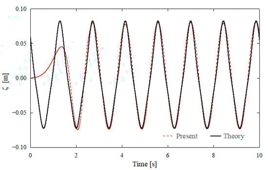 The wave and current without the turbine were considered. To generate the waves and currents, a third-order Stokes theory was used, which was more consistent with the actual wave. The current of = 0.68 m/s and the wave of = 0.7 Hz and = 80 mm were considered at the inlet boundary. The profile of the generated wave was compared with that of the third-order Stokes wave theory. The computational domain size was same for the turbine simulation cases. The converged wave profile was obtained after two wavelengths. The comparison between the present and the theory is shown in Figure 5. The wave profile was captured above the turbine center at different times. After the numerical stabilization of the waves, the root mean square error (RMSE) between the theoretical data and present results was 0.0071. The present results were similar to the theoretical results, which verified the accuracy and feasibility of the simulations of the wave and current [25]. The present results demonstrated a satisfactory agreement with the theoretical results, indicating that the feasibility and accuracy of the wave and current simulations were verified.