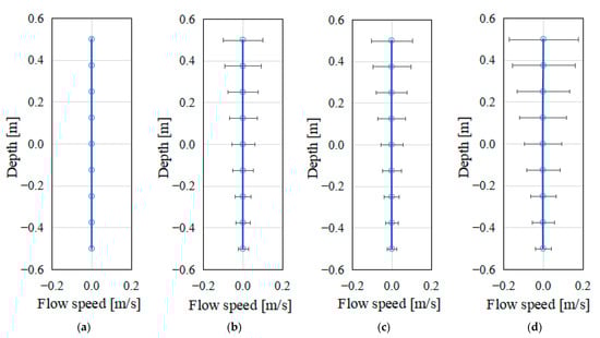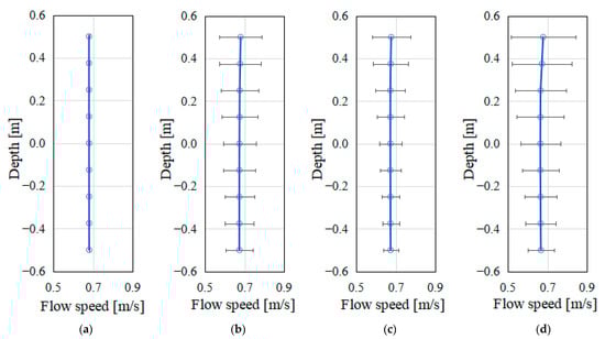 Vertical averaged and variation range under waves and currents: (a) Case 1; (b) Case 2; (c) Case 3; (d) Case 4.