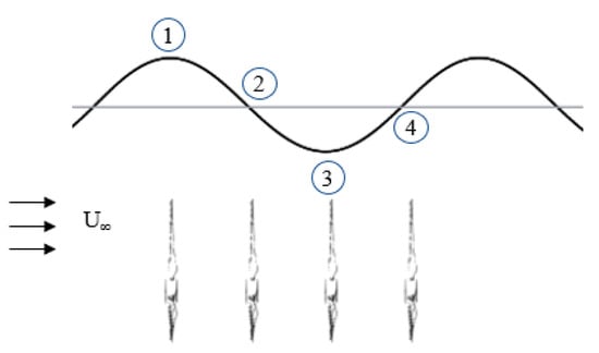 The effect of the waves on the turbine was studied because the axial component of the incoming flow was varied due to the waves. As shown in Figure 9, it was investigated for the wave crest (①), down-crossing (②), trough (③), and up-crossing (④) according to the wave profile located on the turbine.
