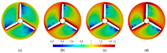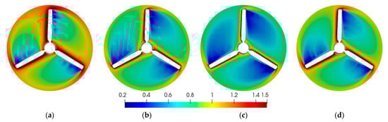 Axial velocity contours around the turbine for various wave elevations: (a) crest; (b) down-crossing; (c) trough; (d) up-crossing.