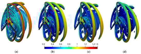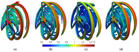 Vortical flow with iso-surfaces of Q = 0.1 at wave crest of different wave conditions: (a) Case 1; (b) Case 2; (c) Case 3; (d) Case 4.