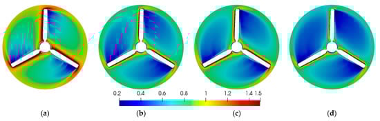 Axial velocity contours around the turbine at wave trough of different wave conditions: (a) Case 1; (b) Case 2; (c) Case 3; (d) Case 4.