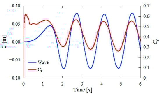 The turbine’s performance under the waves and currents was studied. The power coefficients obtained from the current of = 0.68 m/s and the wave of = 0.7 Hz and = 80 mm were compared with the experimental data [23] (Figure 8). The power coefficients for various TSRs are shown in Figure 4. The power coefficients used were the mean value due to the wave. The present CFD results were consistent with the experimental data, confirming that the selected numerical methods could predict the performance of the turbine quite accurately. The maximum power coefficient was observed at TSR = 4.5 under the waves and currents.