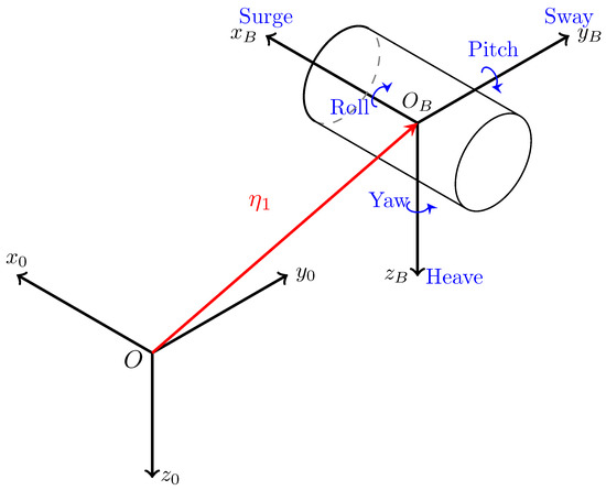 Matrices and refer to the mass effects of the rigid body while and are the hydrodynamic effects applied to the vehicle and called added mass effects. The interested reader can refer to [18,19,20,21] for more details about added mass coefficients, matrices structures for different vehicles and hull shapes as well as calculation and approximation methods for those coefficients.