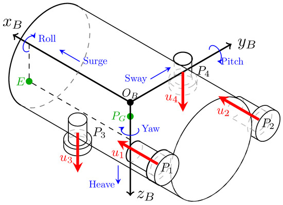 where is the Thruster Configuration Matrix (TCM) detailed in [22,23], and is a vector containing the propulsive thrusts. Matrix defines the propulsive configuration of the vehicle. As an example, we consider an underwater vehicle equipped with 4-fixed thrusters: and longitudinal at the stern and and vertical in the middle of the hull. We call this configuration the “RSM”robot, and it is displayed in Figure 2. The TCM matrix of the RSM propulsive configuration is: