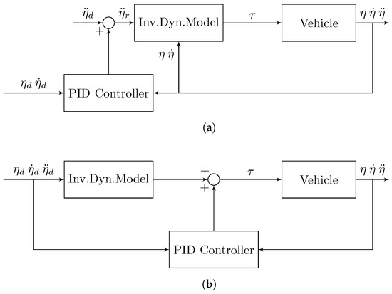 Obviously, such linearizing controllers are not only used with marine vehicles. They can be applied to many nonlinear systems as in [49,50]. Linearizing controllers are applied to a generic dynamic system in the former and to a manipulator arm in the latter. These two references refer to the methods used as the Computed torque. Although it is very close to the linearization methods used in the following examples, the term “computed torque” is rarely used when working with marine craft.