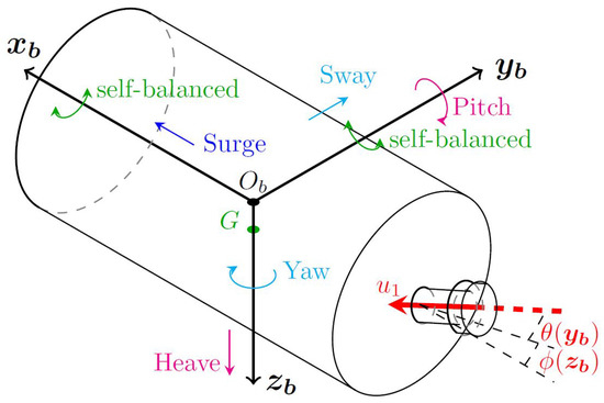 Therefore, the RSM robot is an example of an underactuated underwater vehicle for a 6-DOF task. The propulsive configuration cannot produce any force on the axis or moment around the axis.