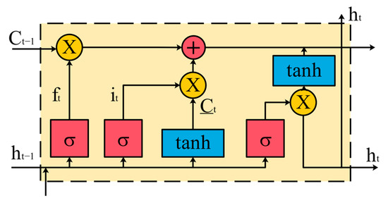 where and are the weight matrix of the input gate, and are the deviation vectors of the output gates, is the current input cell state. The network structure diagram of LSTM is shown in Figure 1.