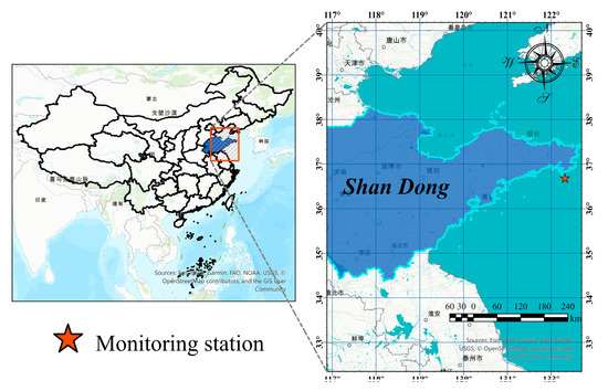 To investigate the wave effects of forecast models with different statistical characteristics, we used the National Marine Data Center, National Science and Technology Resource Sharing Service Platform of China (http://mds.nmdis.org.cn/, accessed on 8 November 2022) to obtain significant wave height (SWH) data from the ShiDao site in Shandong province along the east coast of China. The locations of the east coast of China measured in this paper are shown in Figure 3.