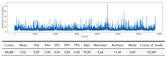 The theoretical foundations of both CEEMDAN and LSTM have been established. In order to avoid training errors in the training set being mixed with the test set, which ultimately results in prediction errors. The first 90% of the dataset was classified as the training set and the last 10% was classified as the test set. For the ShiDao dataset, there were 61252 and 6806 data, respectively. Figure 4 shows the time history data and statistical information of significant wave height for ShiDao monitoring station.